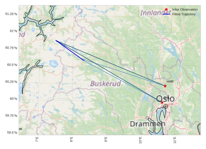 The map shows the bearings for the meteor. The lighter lines show the directions from the observation sites at the meteor's appearance, and the darker lines show where it was last seen. The blue arrow indicates the visible path of the meteor.