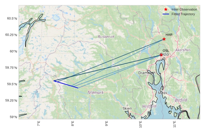 The map shows the bearings for the meteor. The lighter lines show the directions from the observation sites at the meteor's appearance, and the darker lines show where it was last seen. The blue arrow indicates the visible path of the meteor.