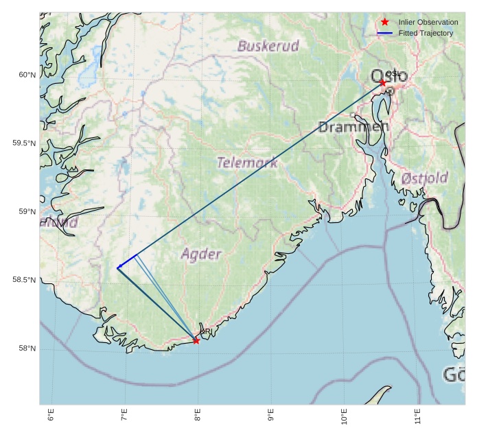 The map shows the bearings for the meteor. The lighter lines show the directions from the observation sites at the meteor's appearance, and the darker lines show where it was last seen. The blue arrow indicates the visible path of the meteor.