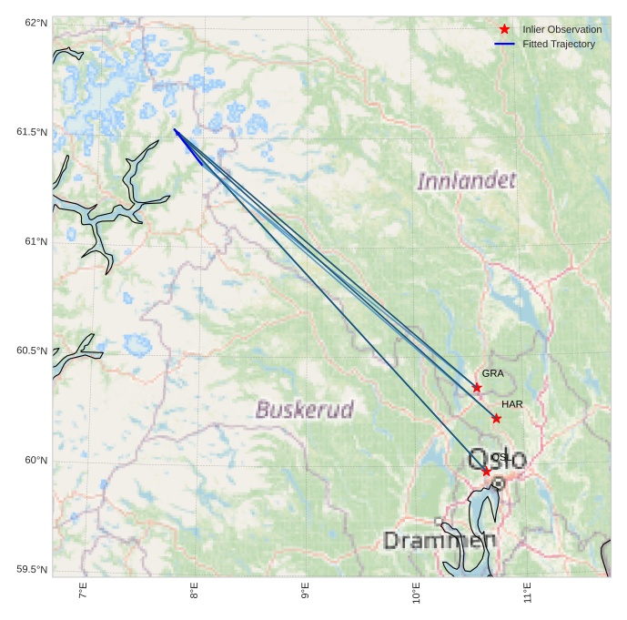The map shows the bearings for the meteor. The lighter lines show the directions from the observation sites at the meteor's appearance, and the darker lines show where it was last seen. The blue arrow indicates the visible path of the meteor.