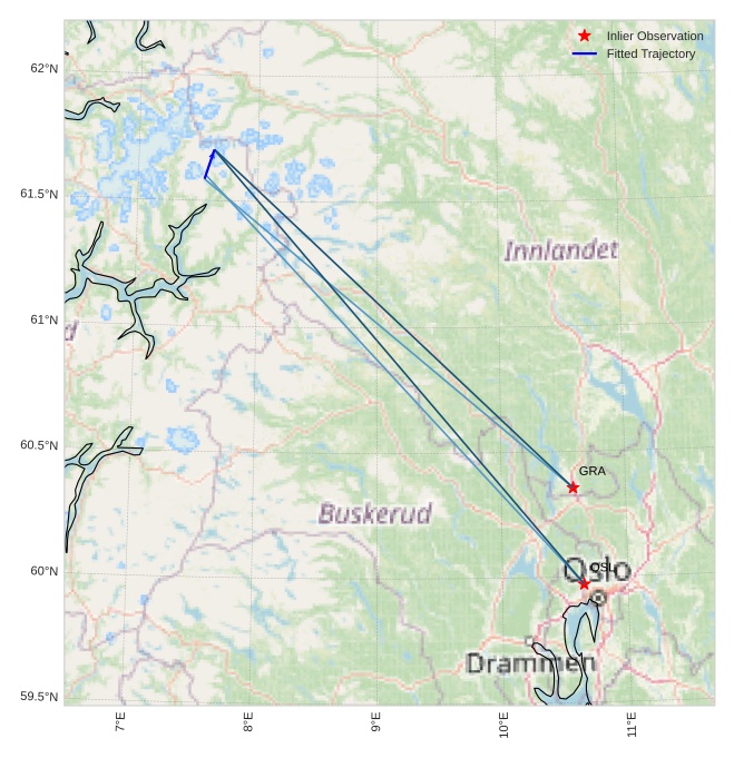 The map shows the bearings for the meteor. The lighter lines show the directions from the observation sites at the meteor's appearance, and the darker lines show where it was last seen. The blue arrow indicates the visible path of the meteor.