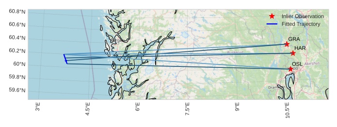 The map shows the bearings for the meteor. The lighter lines show the directions from the observation sites at the meteor's appearance, and the darker lines show where it was last seen. The blue arrow indicates the visible path of the meteor.