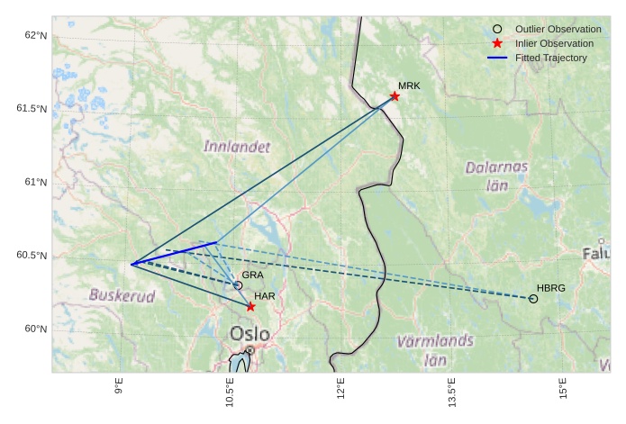 The map shows the bearings for the meteor. The lighter lines show the directions from the observation sites at the meteor's appearance, and the darker lines show where it was last seen. The blue arrow indicates the visible path of the meteor.