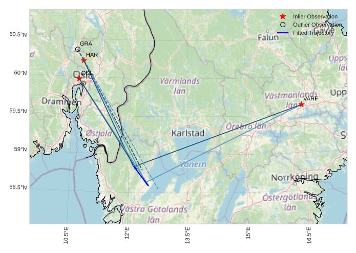 The map shows the bearings for the meteor. The lighter lines show the directions from the observation sites at the meteor's appearance, and the darker lines show where it was last seen. The blue arrow indicates the visible path of the meteor.