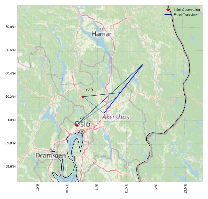 The map shows the bearings for the meteor. The lighter lines show the directions from the observation sites at the meteor's appearance, and the darker lines show where it was last seen. The blue arrow indicates the visible path of the meteor.