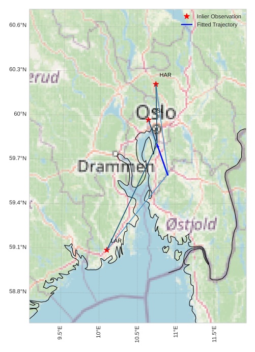 The map shows the bearings for the meteor. The lighter lines show the directions from the observation sites at the meteor's appearance, and the darker lines show where it was last seen. The blue arrow indicates the visible path of the meteor.