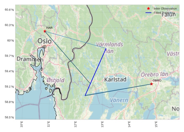 The map shows the bearings for the meteor. The lighter lines show the directions from the observation sites at the meteor's appearance, and the darker lines show where it was last seen. The blue arrow indicates the visible path of the meteor.