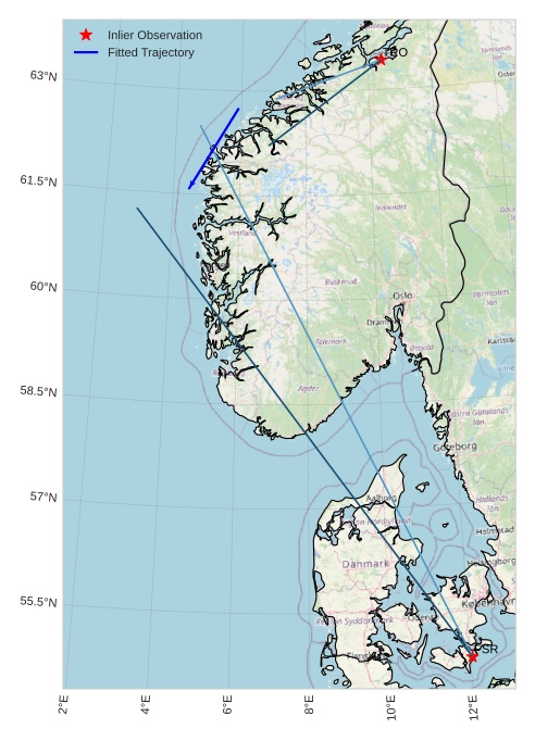 The map shows the bearings for the meteor. The lighter lines show the directions from the observation sites at the meteor's appearance, and the darker lines show where it was last seen. The blue arrow indicates the visible path of the meteor.