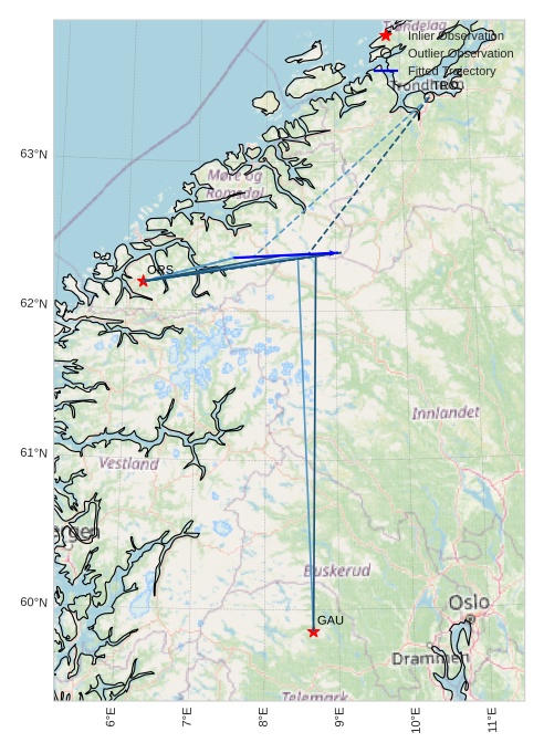 The map shows the bearings for the meteor. The lighter lines show the directions from the observation sites at the meteor's appearance, and the darker lines show where it was last seen. The blue arrow indicates the visible path of the meteor.