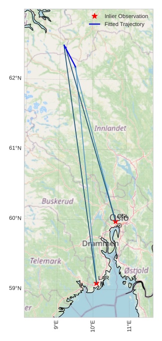 The map shows the bearings for the meteor. The lighter lines show the directions from the observation sites at the meteor's appearance, and the darker lines show where it was last seen. The blue arrow indicates the visible path of the meteor.