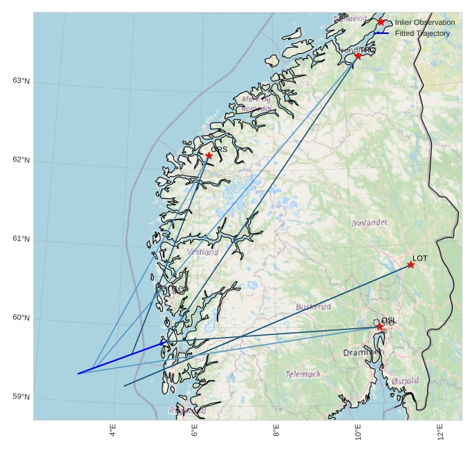 The map shows the bearings for the meteor. The lighter lines show the directions from the observation sites at the meteor's appearance, and the darker lines show where it was last seen. The blue arrow indicates the visible path of the meteor.