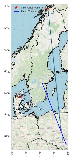 The map shows the bearings for the meteor. The lighter lines show the directions from the observation sites at the meteor's appearance, and the darker lines show where it was last seen. The blue arrow indicates the visible path of the meteor.