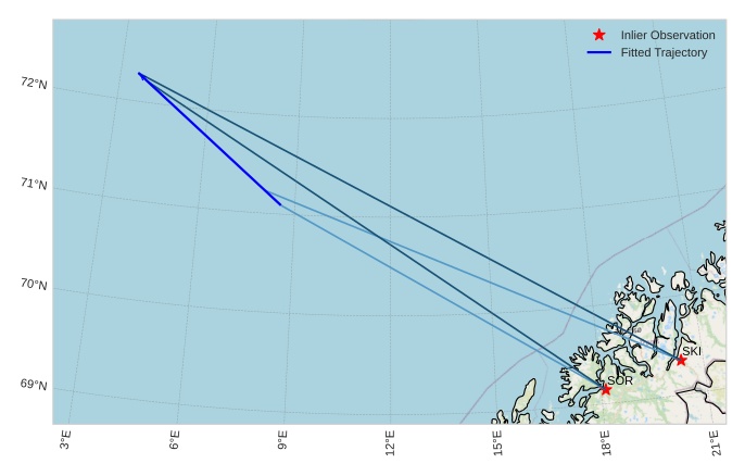 The map shows the bearings for the meteor. The lighter lines show the directions from the observation sites at the meteor's appearance, and the darker lines show where it was last seen. The blue arrow indicates the visible path of the meteor.