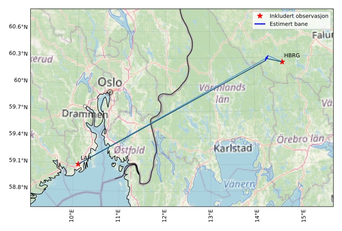 Kartet viser peilingene for meteoren. De lysere linjene viser retningene fra observasjonsstedene for meteorens tilsynekomst, og de mørkere linjene viser hvor den sist kunne sees. Den blå pila viser meteorens synlige ferd.