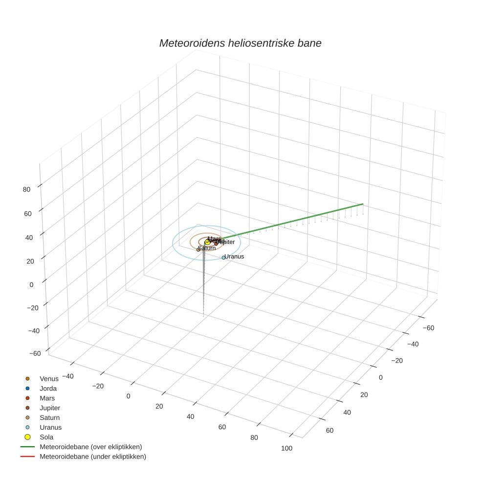Plottet under viser meteoridens bane i solsystemet. Grønn del av banen ligger over ekliptikken og rød del under.