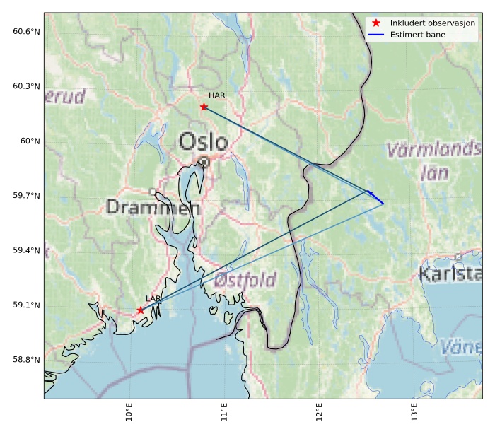 Kartet viser peilingene for meteoren. De lysere linjene viser retningene fra observasjonsstedene for meteorens tilsynekomst, og de mørkere linjene viser hvor den sist kunne sees. Den blå pila viser meteorens synlige ferd.