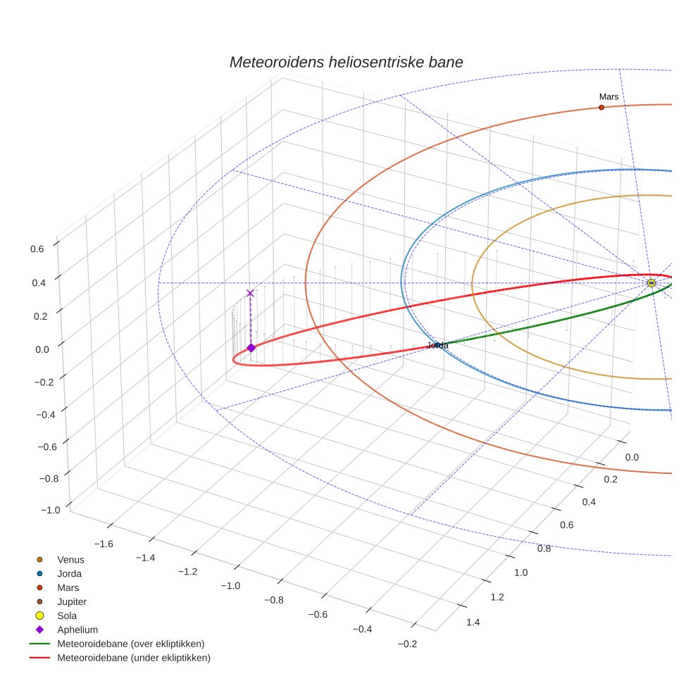 Plottet under viser meteoridens bane i solsystemet. Grønn del av banen ligger over ekliptikken og rød del under.