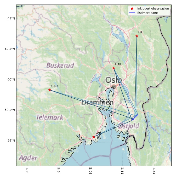 Kartet viser peilingene for meteoren. De lysere linjene viser retningene fra observasjonsstedene for meteorens tilsynekomst, og de mørkere linjene viser hvor den sist kunne sees. Den blå pila viser meteorens synlige ferd.