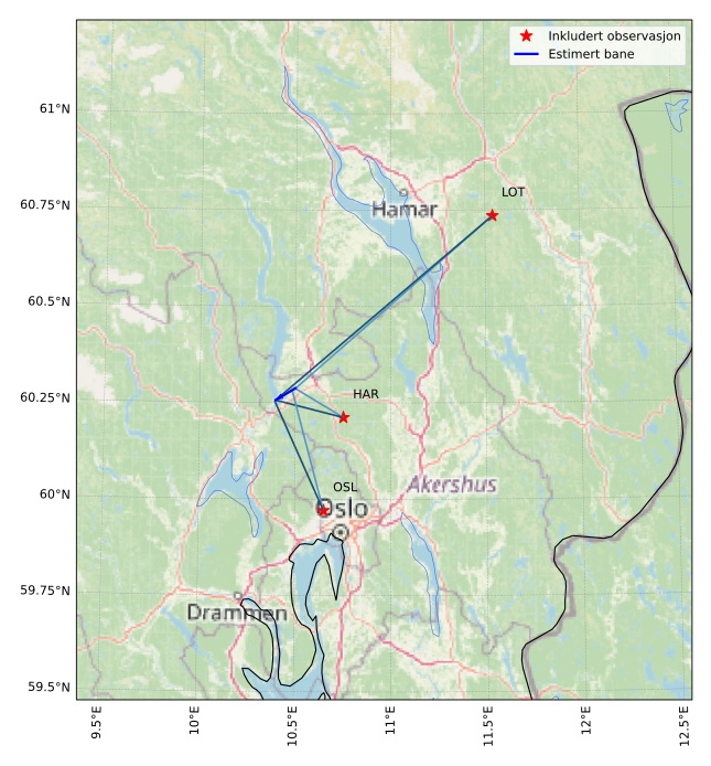Kartet viser peilingene for meteoren. De lysere linjene viser retningene fra observasjonsstedene for meteorens tilsynekomst, og de mørkere linjene viser hvor den sist kunne sees. Den blå pila viser meteorens synlige ferd.