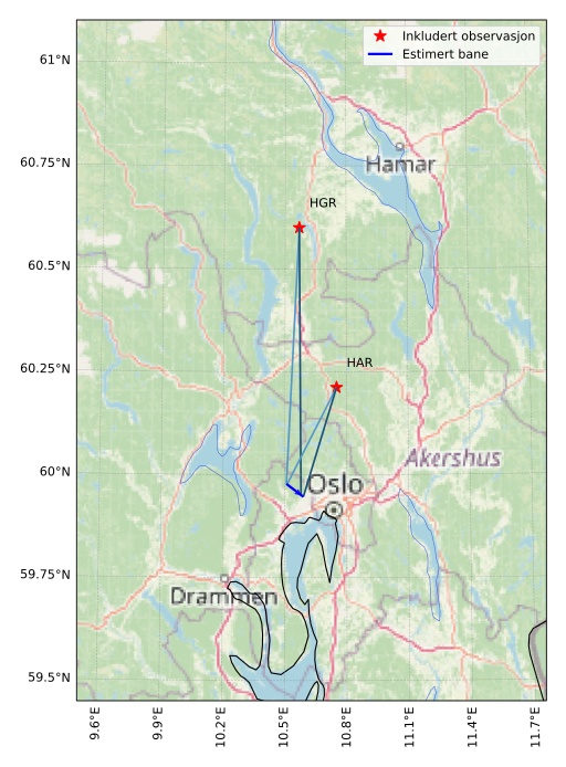 Kartet viser peilingene for meteoren. De lysere linjene viser retningene fra observasjonsstedene for meteorens tilsynekomst, og de mørkere linjene viser hvor den sist kunne sees. Den blå pila viser meteorens synlige ferd.