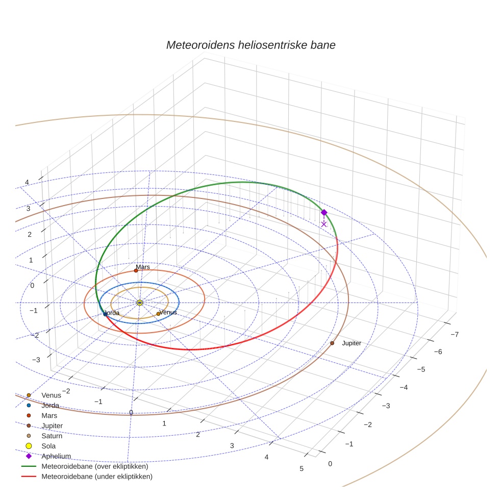 Plottet under viser meteoridens bane i solsystemet. Grønn del av banen ligger over ekliptikken og rød del under.