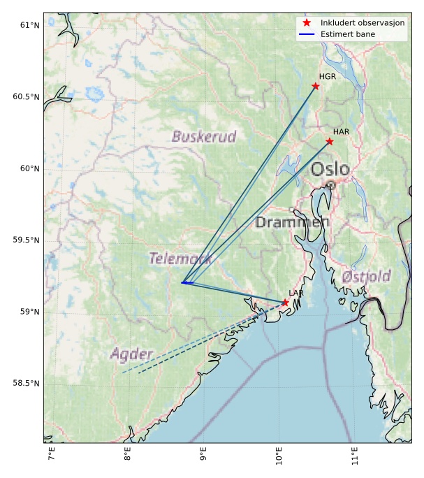 Kartet viser peilingene for meteoren. De lysere linjene viser retningene fra observasjonsstedene for meteorens tilsynekomst, og de mørkere linjene viser hvor den sist kunne sees. Den blå pila viser meteorens synlige ferd.