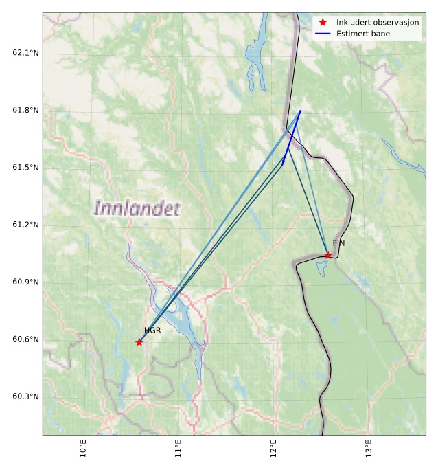 Kartet viser peilingene for meteoren. De lysere linjene viser retningene fra observasjonsstedene for meteorens tilsynekomst, og de mørkere linjene viser hvor den sist kunne sees. Den blå pila viser meteorens synlige ferd.