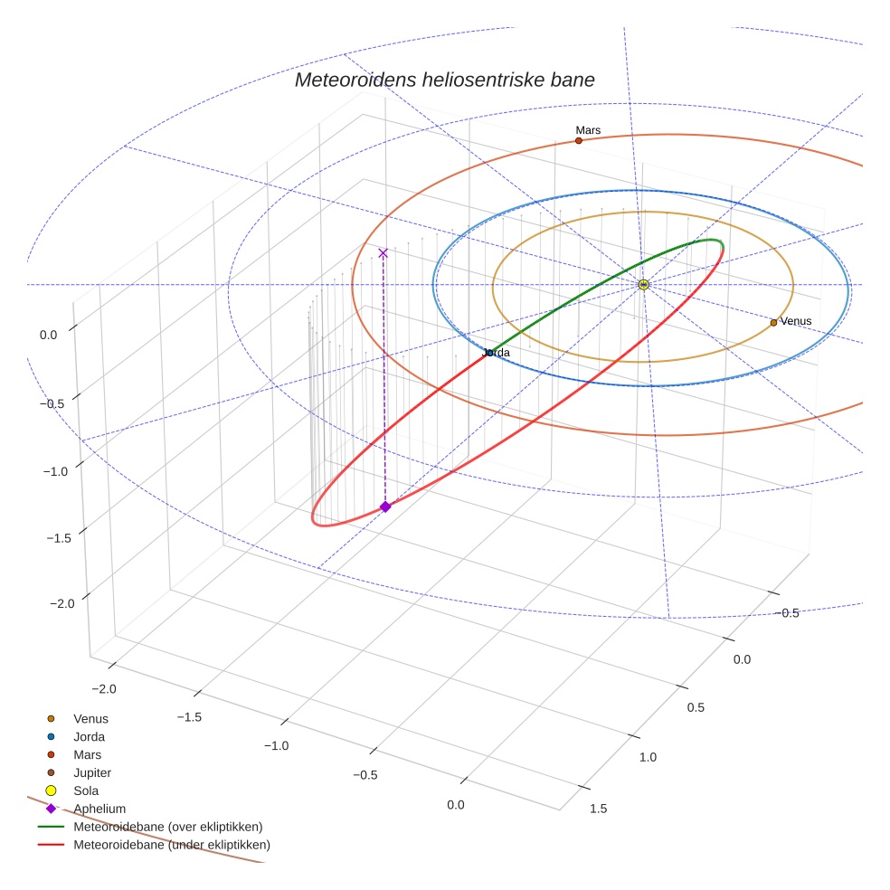 Plottet under viser meteoridens bane i solsystemet. Grønn del av banen ligger over ekliptikken og rød del under.