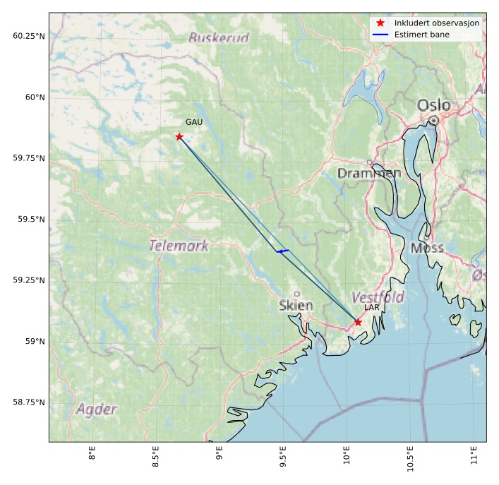 Kartet viser peilingene for meteoren. De lysere linjene viser retningene fra observasjonsstedene for meteorens tilsynekomst, og de mørkere linjene viser hvor den sist kunne sees. Den blå pila viser meteorens synlige ferd.