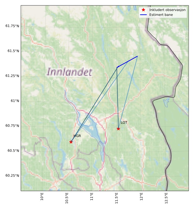 Kartet viser peilingene for meteoren. De lysere linjene viser retningene fra observasjonsstedene for meteorens tilsynekomst, og de mørkere linjene viser hvor den sist kunne sees. Den blå pila viser meteorens synlige ferd.