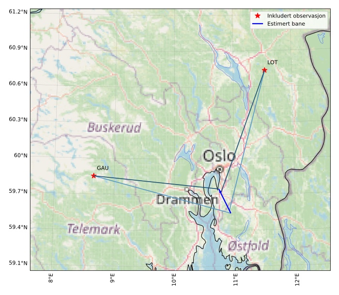 Kartet viser peilingene for meteoren. De lysere linjene viser retningene fra observasjonsstedene for meteorens tilsynekomst, og de mørkere linjene viser hvor den sist kunne sees. Den blå pila viser meteorens synlige ferd.