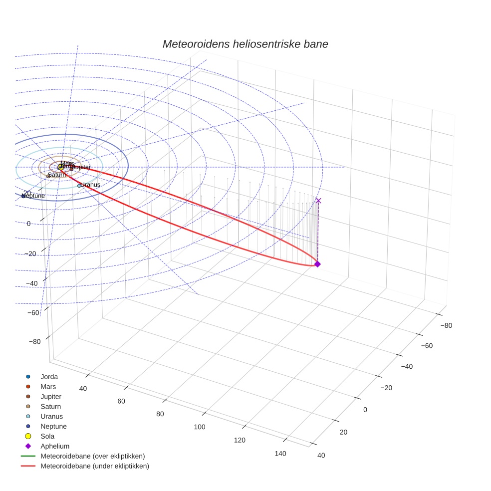 Plottet under viser meteoridens bane i solsystemet. Grønn del av banen ligger over ekliptikken og rød del under.
