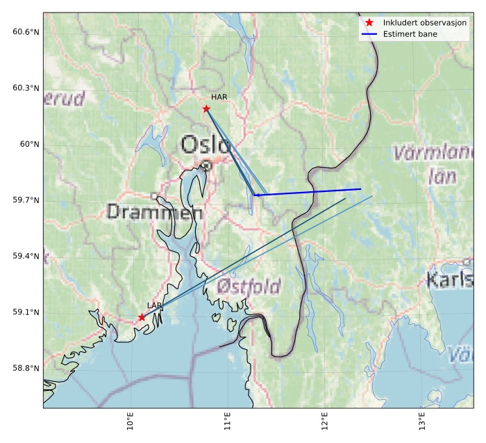 Kartet viser peilingene for meteoren. De lysere linjene viser retningene fra observasjonsstedene for meteorens tilsynekomst, og de mørkere linjene viser hvor den sist kunne sees. Den blå pila viser meteorens synlige ferd.