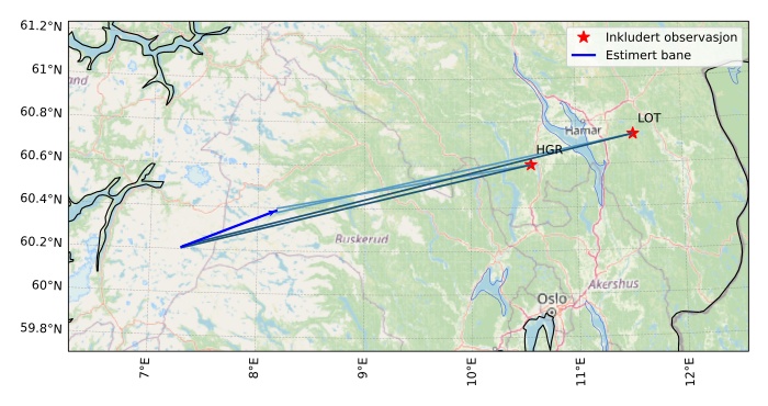 Kartet viser peilingene for meteoren. De lysere linjene viser retningene fra observasjonsstedene for meteorens tilsynekomst, og de mørkere linjene viser hvor den sist kunne sees. Den blå pila viser meteorens synlige ferd.
