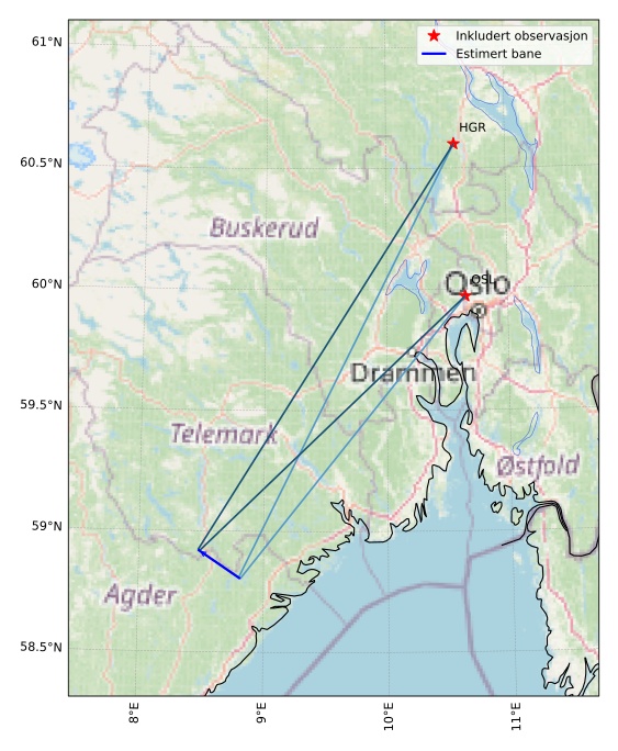 Kartet viser peilingene for meteoren. De lysere linjene viser retningene fra observasjonsstedene for meteorens tilsynekomst, og de mørkere linjene viser hvor den sist kunne sees. Den blå pila viser meteorens synlige ferd.