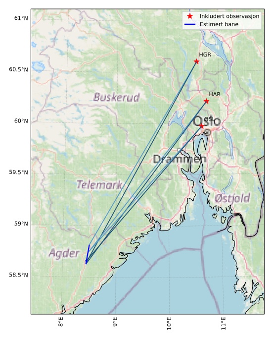 Kartet viser peilingene for meteoren. De lysere linjene viser retningene fra observasjonsstedene for meteorens tilsynekomst, og de mørkere linjene viser hvor den sist kunne sees. Den blå pila viser meteorens synlige ferd.