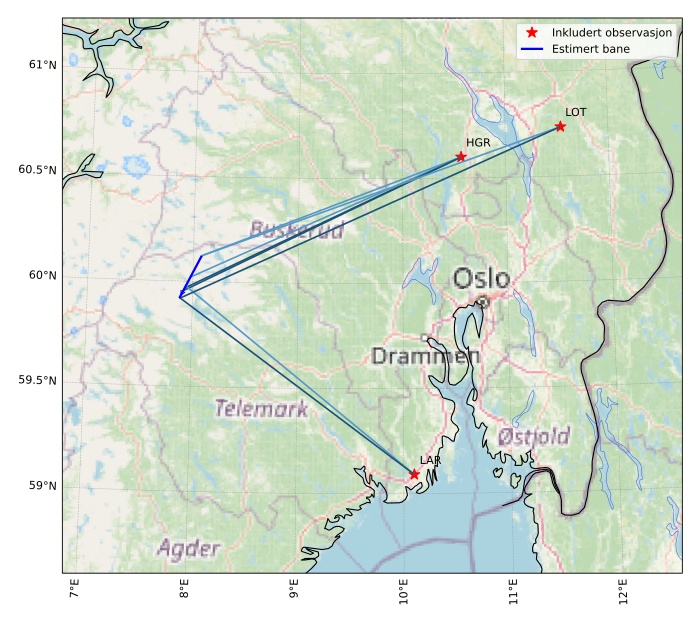 Kartet viser peilingene for meteoren. De lysere linjene viser retningene fra observasjonsstedene for meteorens tilsynekomst, og de mørkere linjene viser hvor den sist kunne sees. Den blå pila viser meteorens synlige ferd.