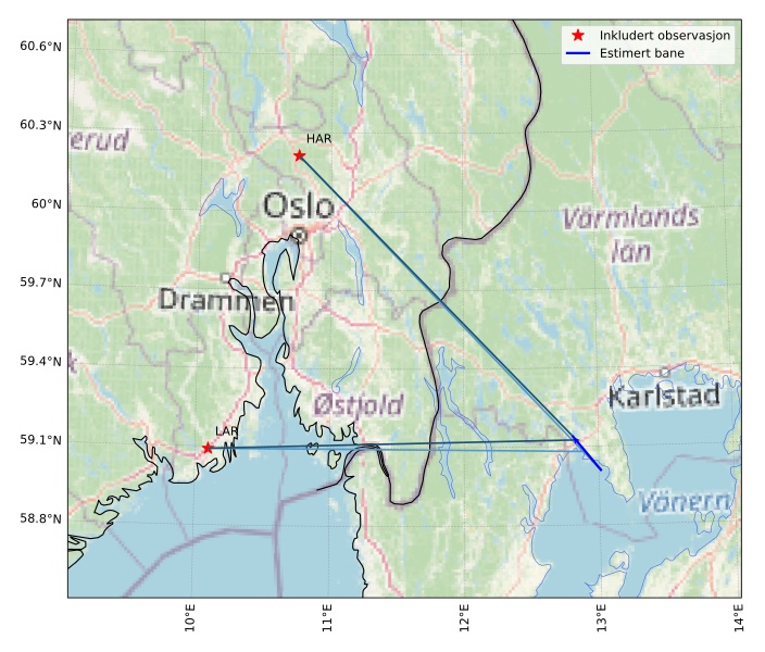 Kartet viser peilingene for meteoren. De lysere linjene viser retningene fra observasjonsstedene for meteorens tilsynekomst, og de mørkere linjene viser hvor den sist kunne sees. Den blå pila viser meteorens synlige ferd.