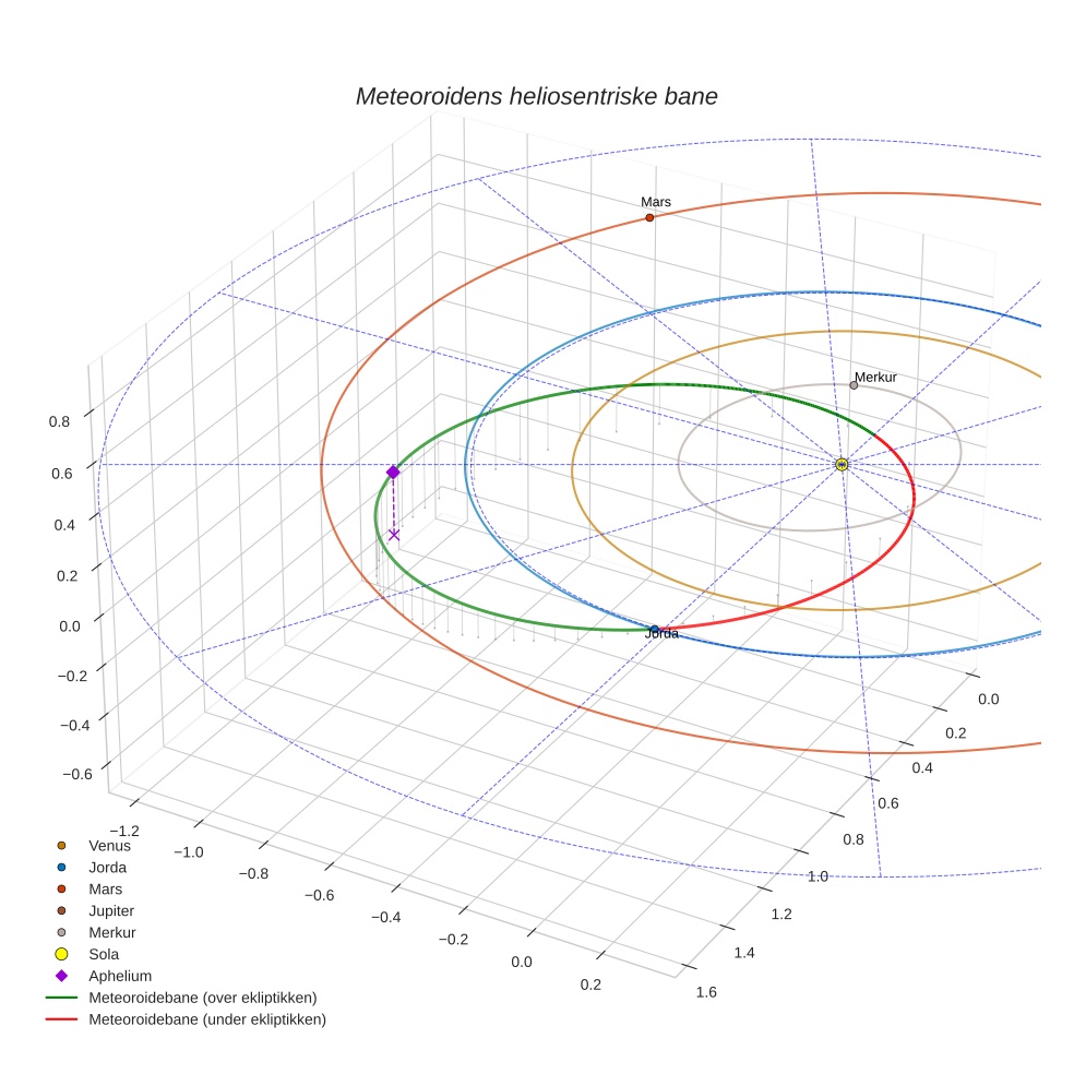 Plottet under viser meteoridens bane i solsystemet. Grønn del av banen ligger over ekliptikken og rød del under.