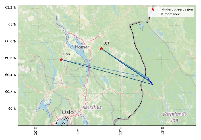 Kartet viser peilingene for meteoren. De lysere linjene viser retningene fra observasjonsstedene for meteorens tilsynekomst, og de mørkere linjene viser hvor den sist kunne sees. Den blå pila viser meteorens synlige ferd.