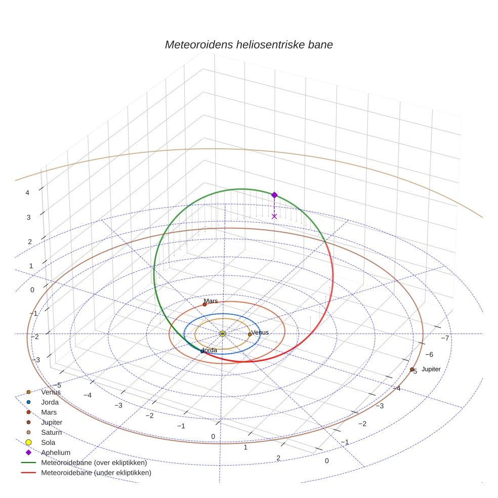 Plottet under viser meteoridens bane i solsystemet. Grønn del av banen ligger over ekliptikken og rød del under.