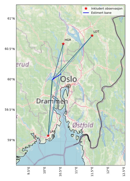 Kartet viser peilingene for meteoren. De lysere linjene viser retningene fra observasjonsstedene for meteorens tilsynekomst, og de mørkere linjene viser hvor den sist kunne sees. Den blå pila viser meteorens synlige ferd.
