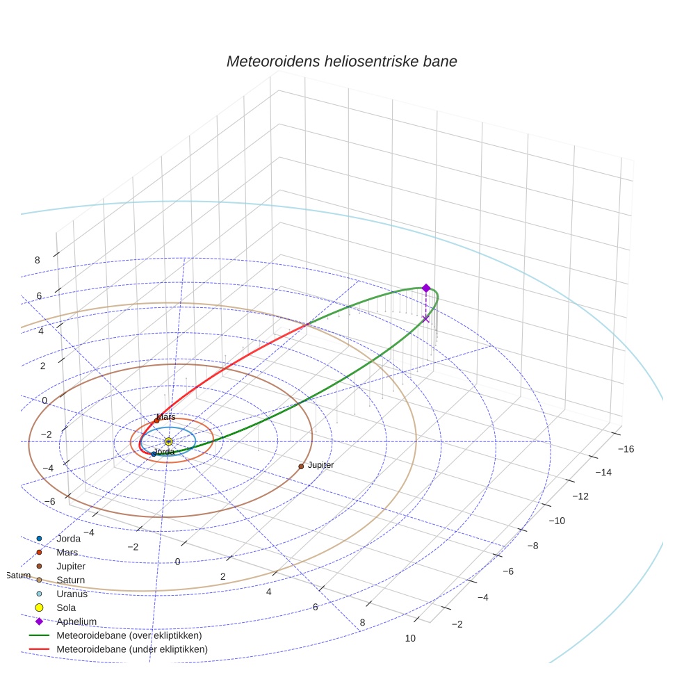 Plottet under viser meteoridens bane i solsystemet. Grønn del av banen ligger over ekliptikken og rød del under.