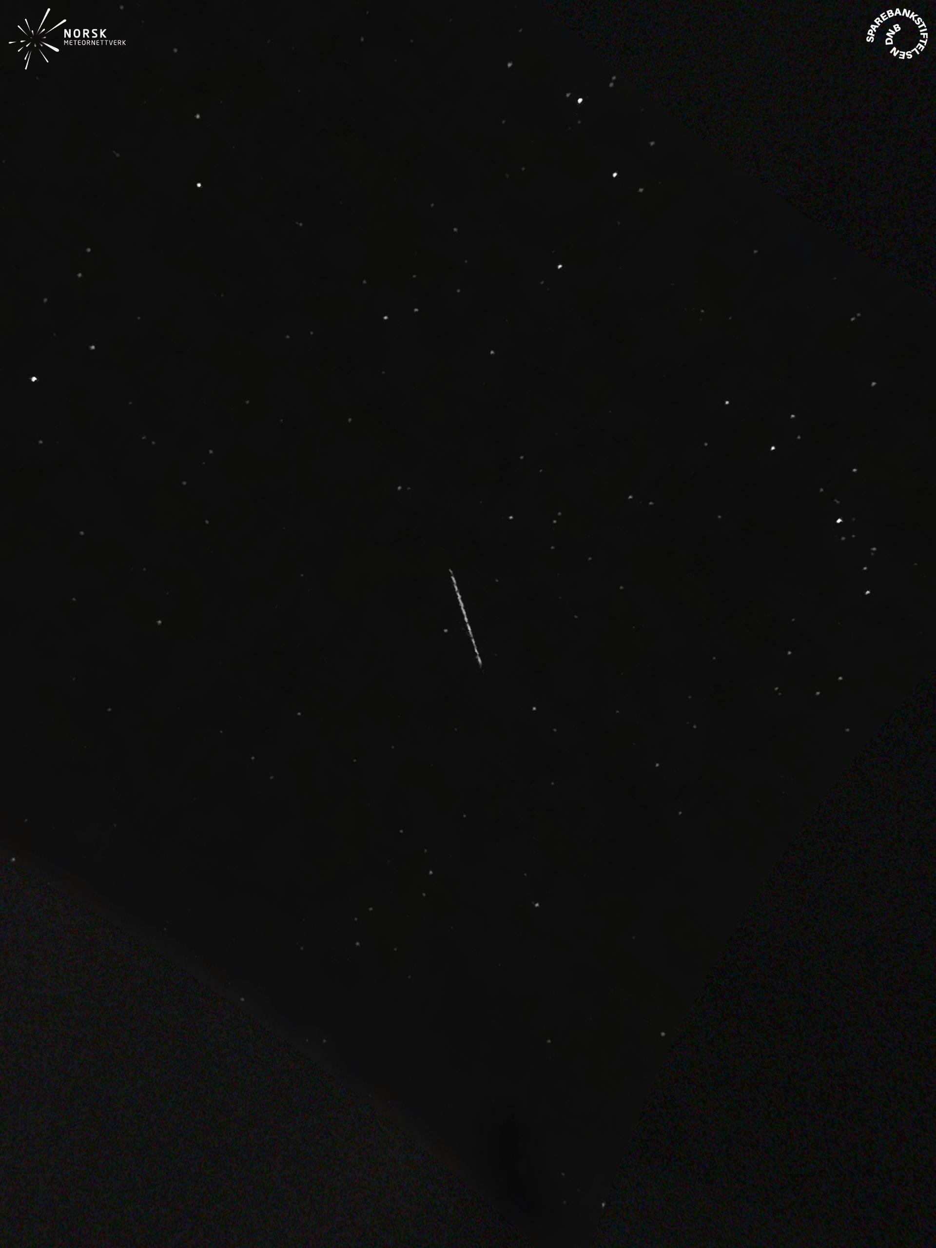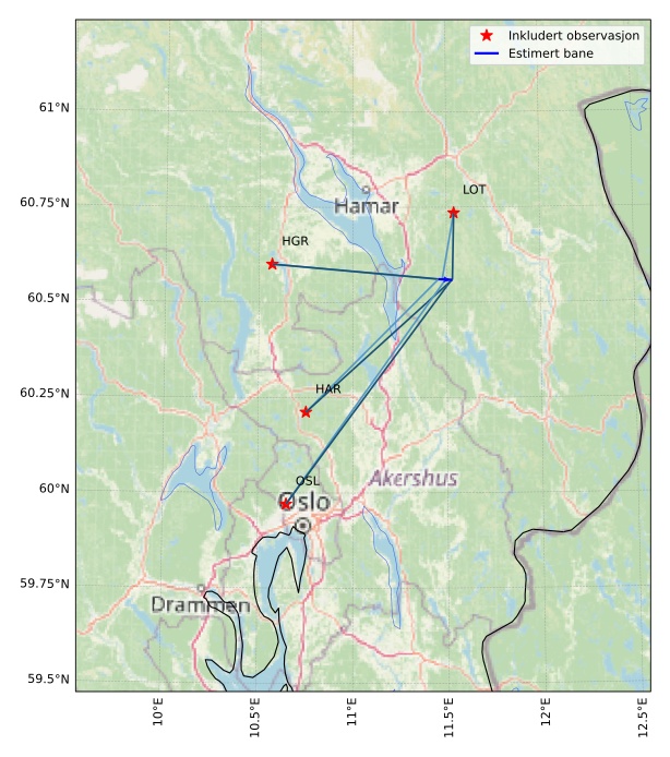 Kartet viser peilingene for meteoren. De lysere linjene viser retningene fra observasjonsstedene for meteorens tilsynekomst, og de mørkere linjene viser hvor den sist kunne sees. Den blå pila viser meteorens synlige ferd.