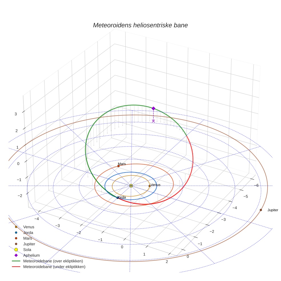Plottet under viser meteoridens bane i solsystemet. Grønn del av banen ligger over ekliptikken og rød del under.