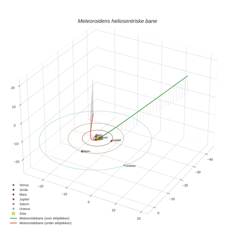 Plottet under viser meteoridens bane i solsystemet. Grønn del av banen ligger over ekliptikken og rød del under.