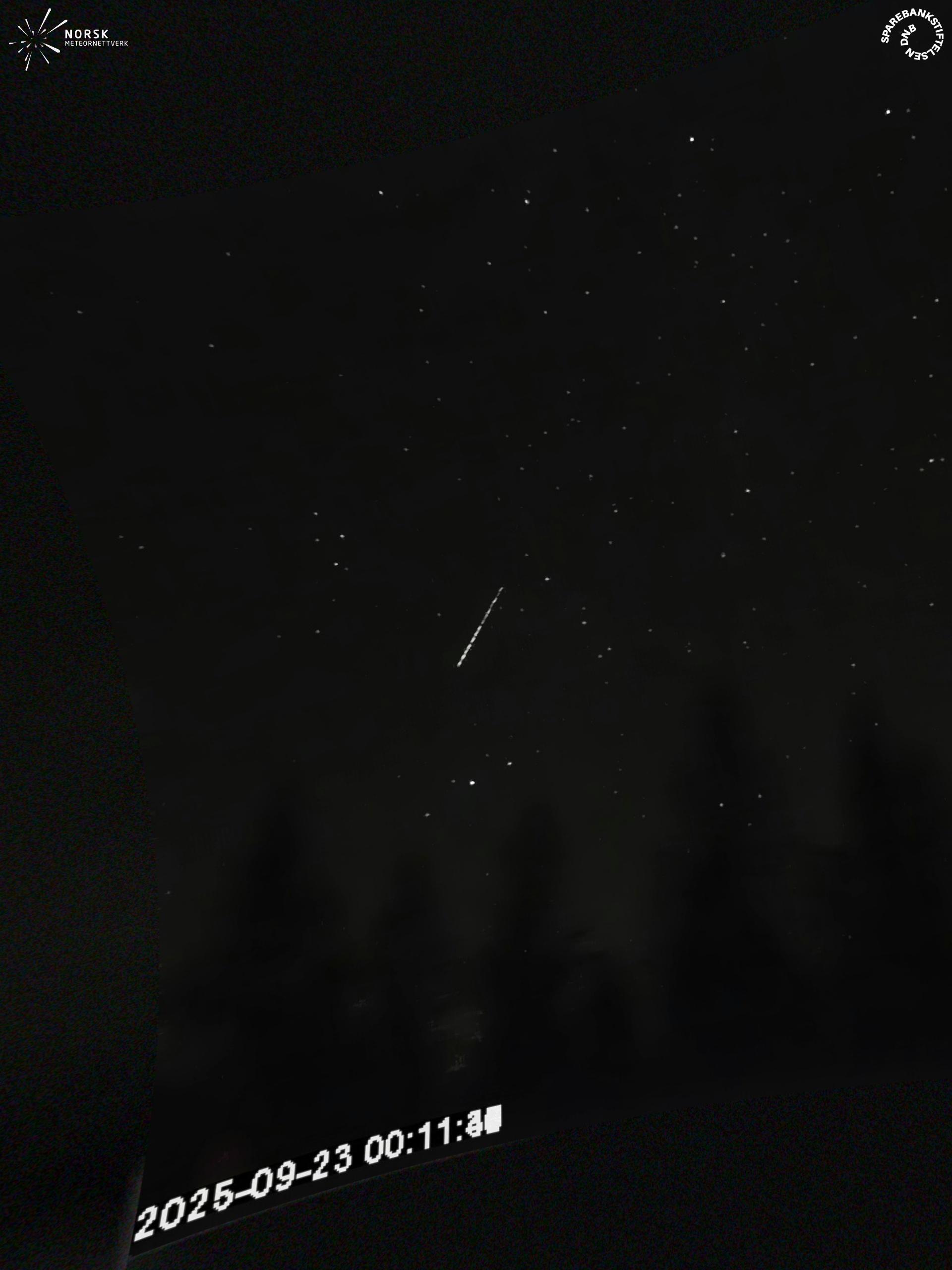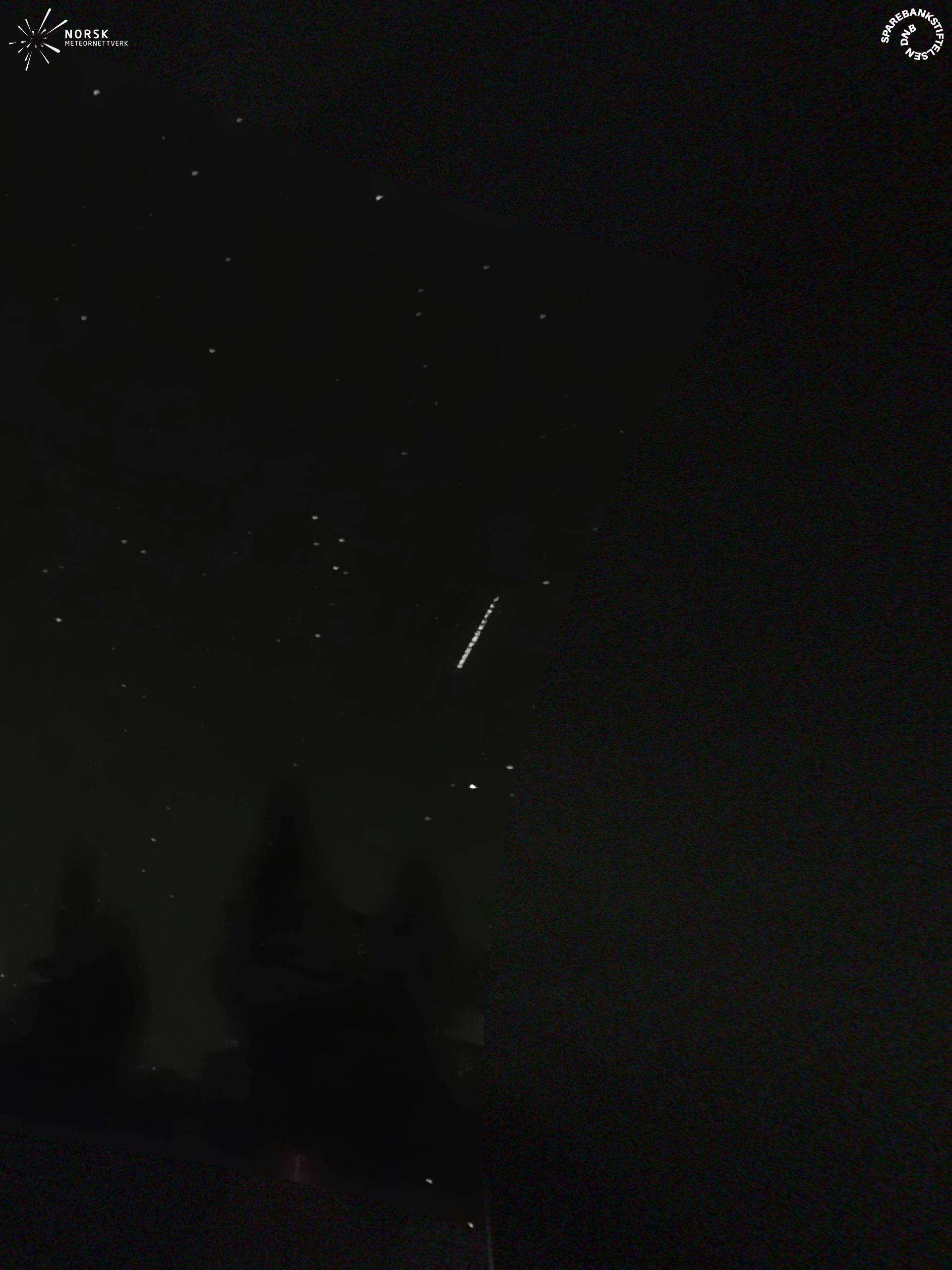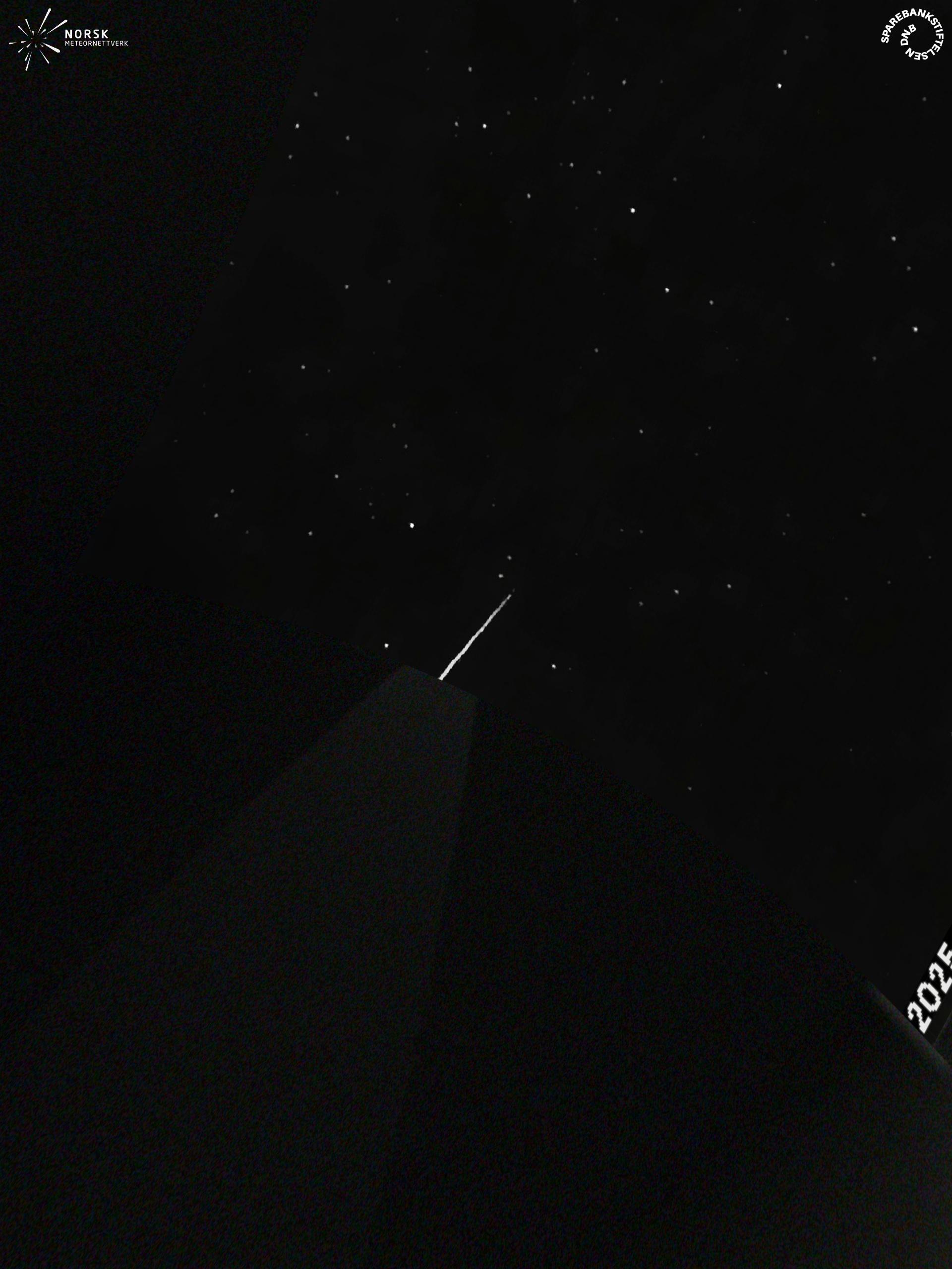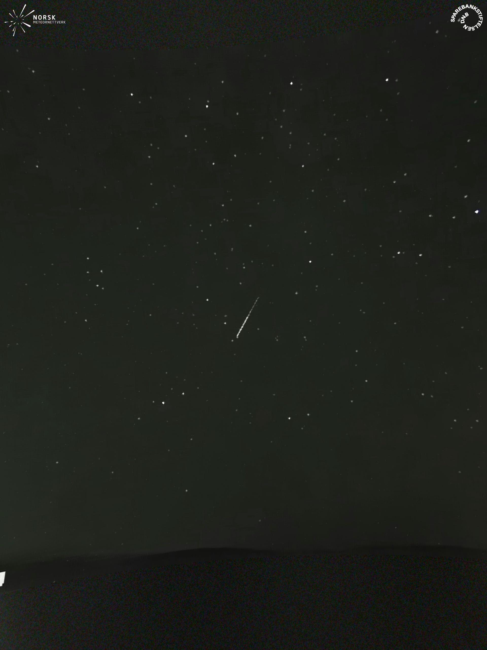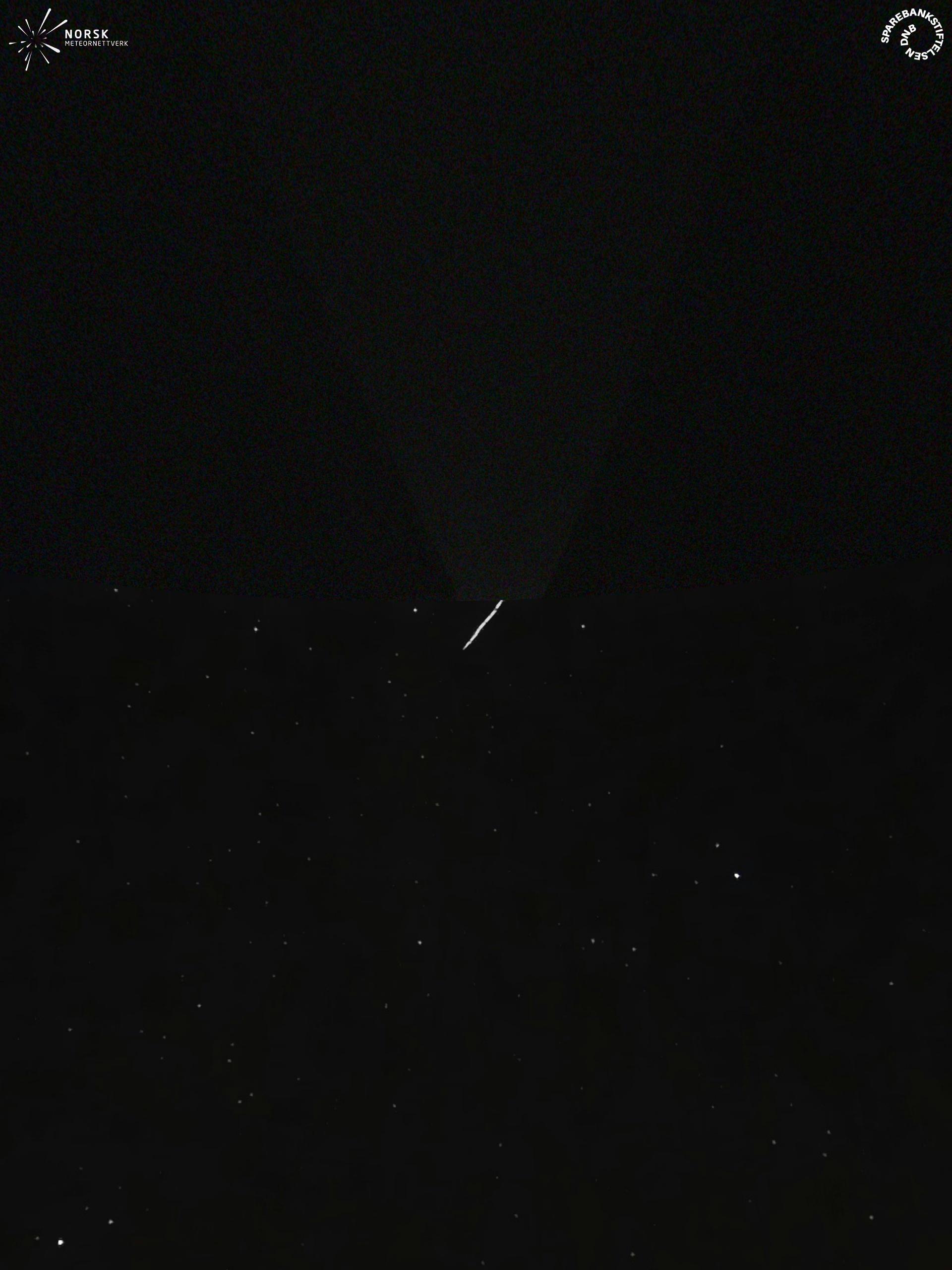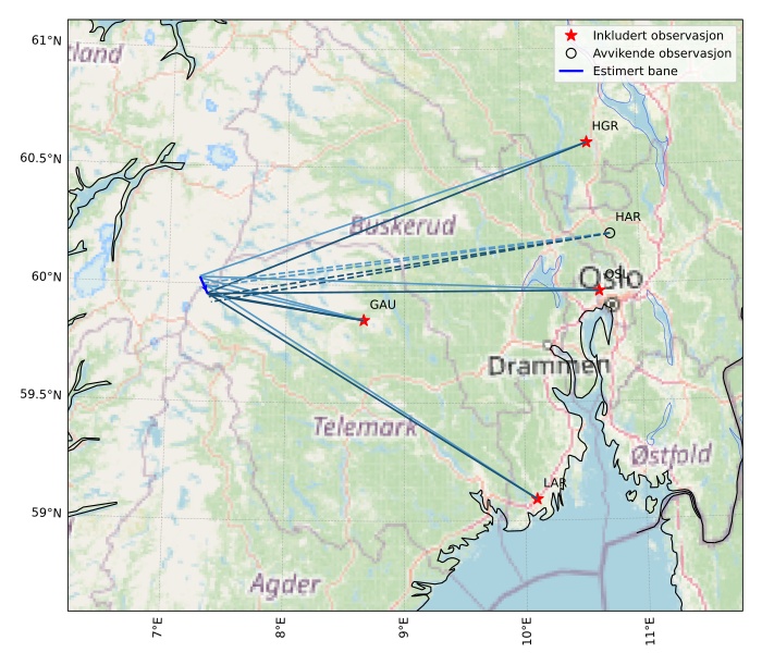 Kartet viser peilingene for meteoren. De lysere linjene viser retningene fra observasjonsstedene for meteorens tilsynekomst, og de mørkere linjene viser hvor den sist kunne sees. Den blå pila viser meteorens synlige ferd.