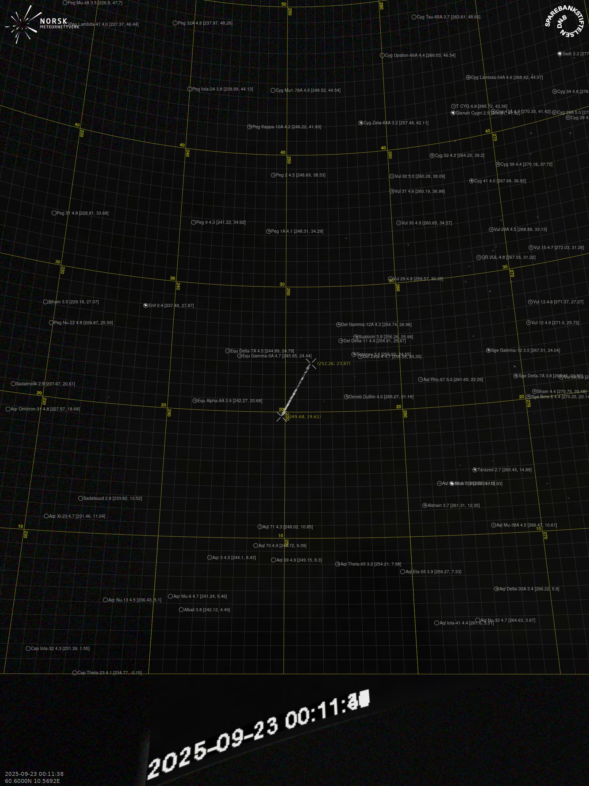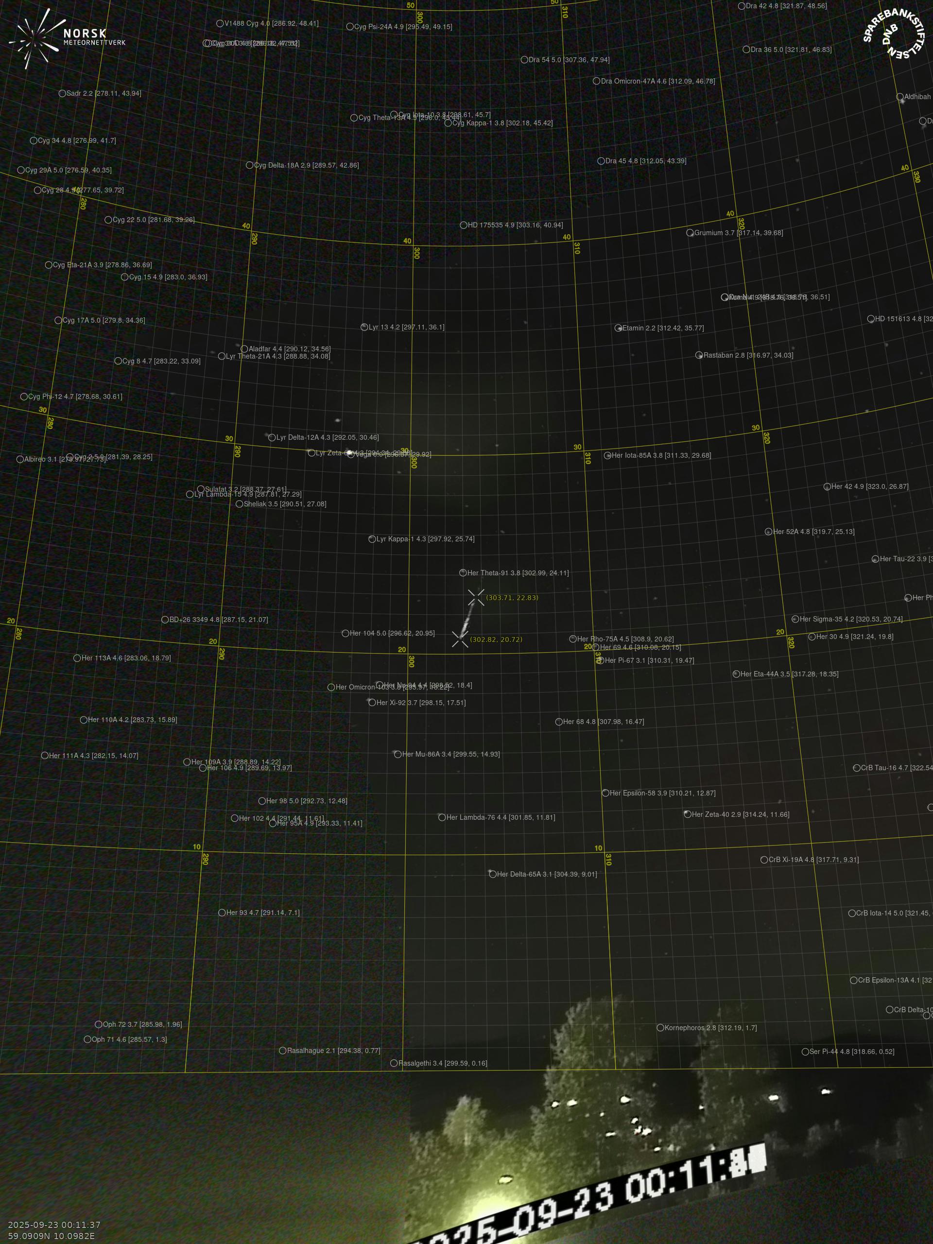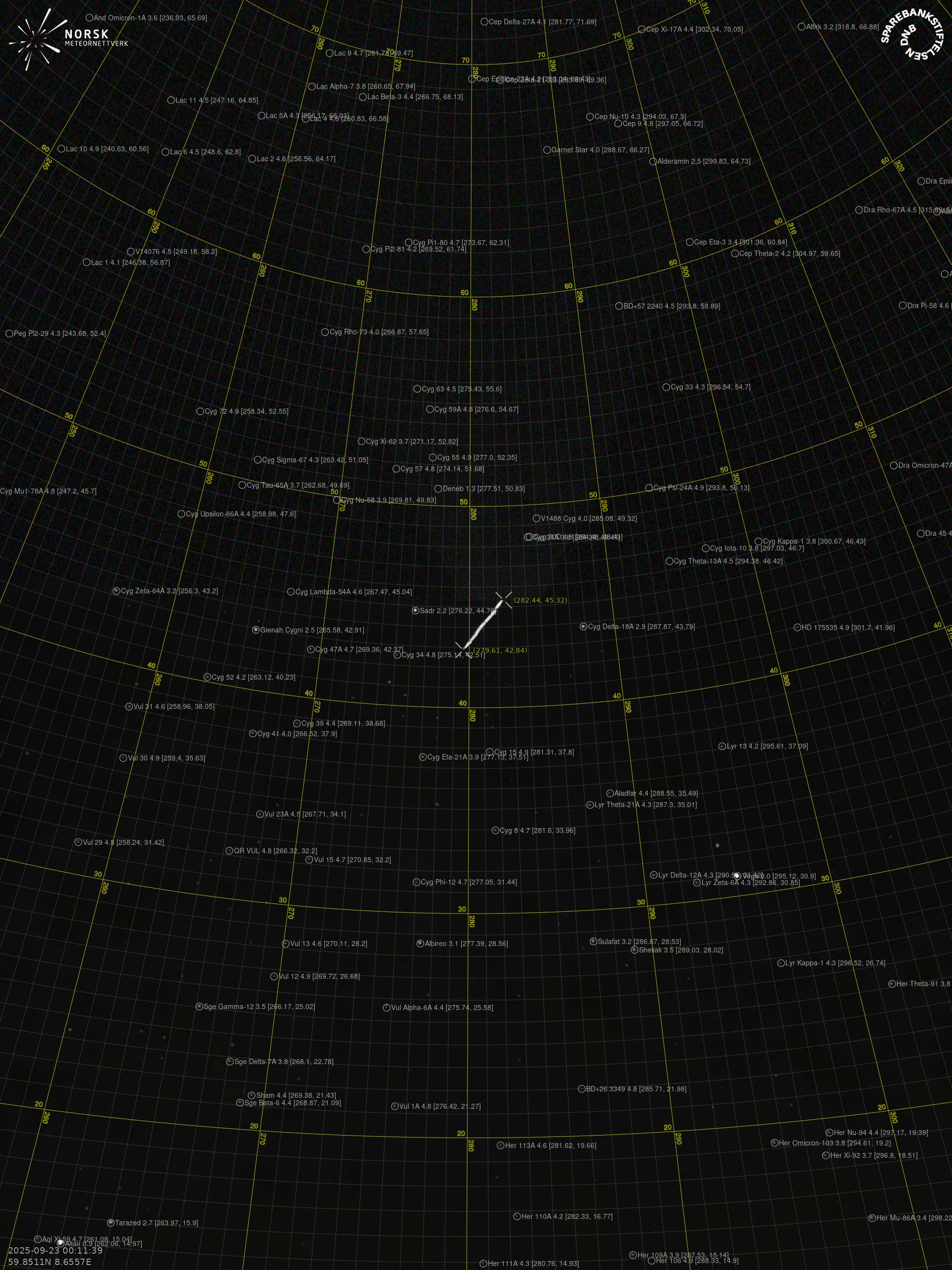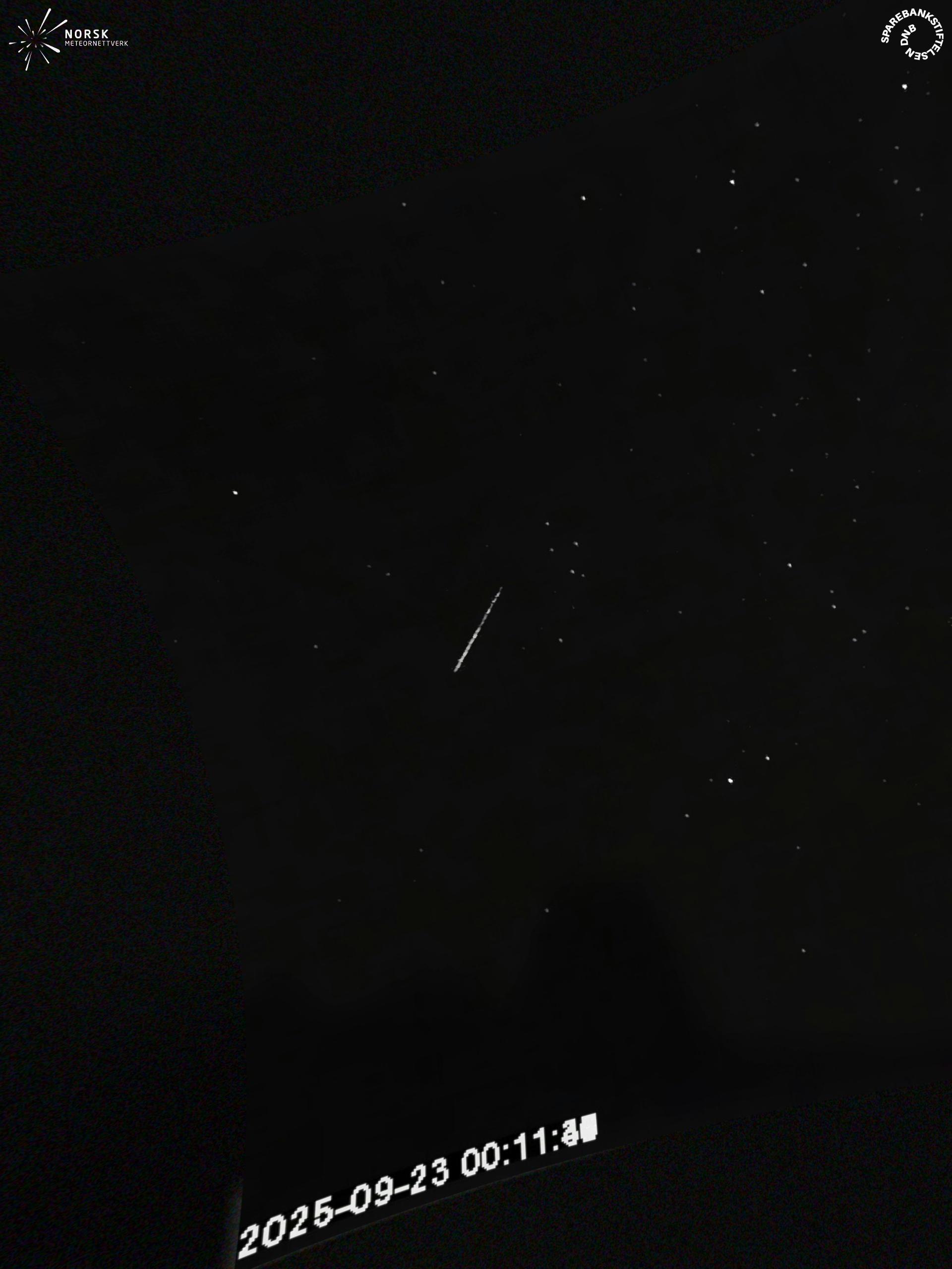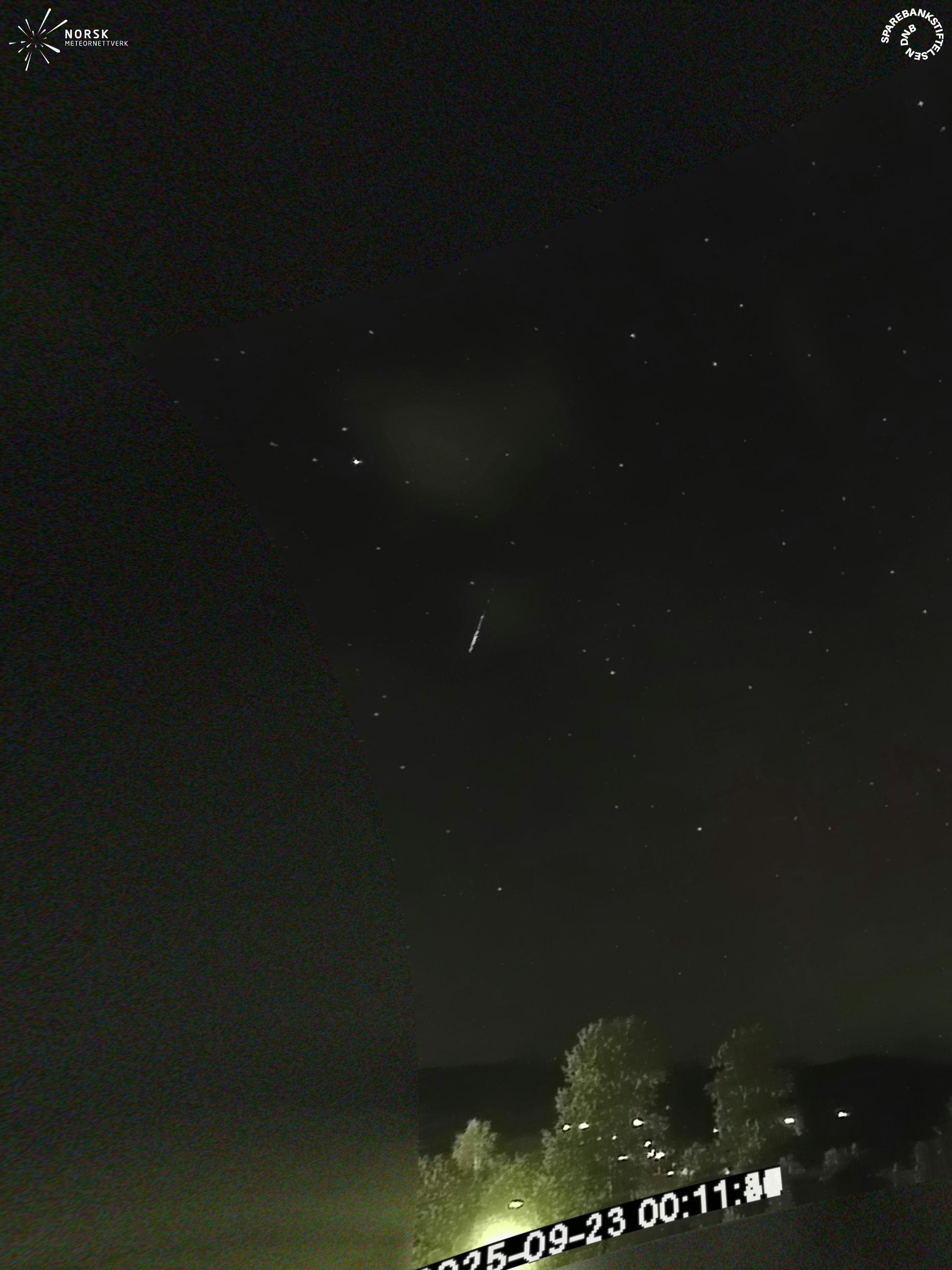 Kartet viser peilingene for meteoren. De lysere linjene viser retningene fra observasjonsstedene for meteorens tilsynekomst, og de mørkere linjene viser hvor den sist kunne sees. Den blå pila viser meteorens synlige ferd.