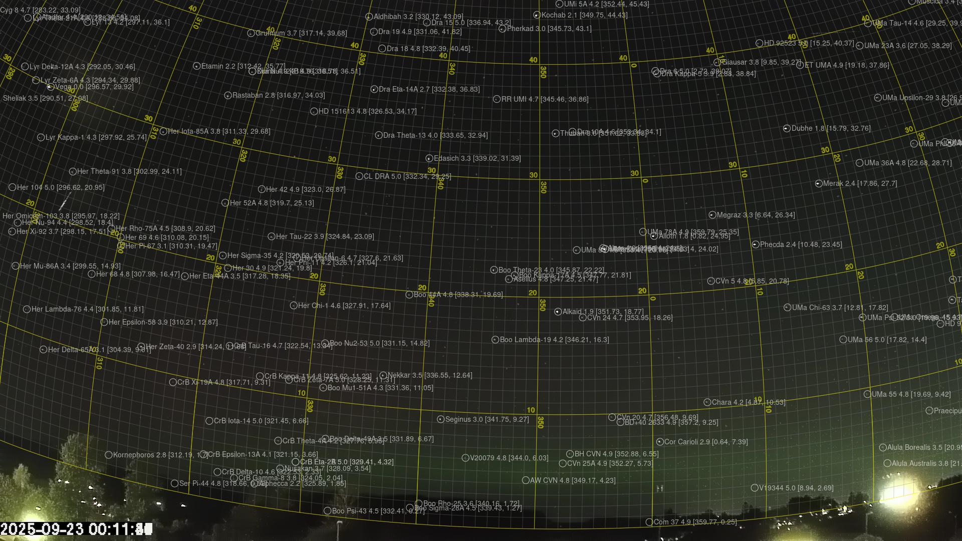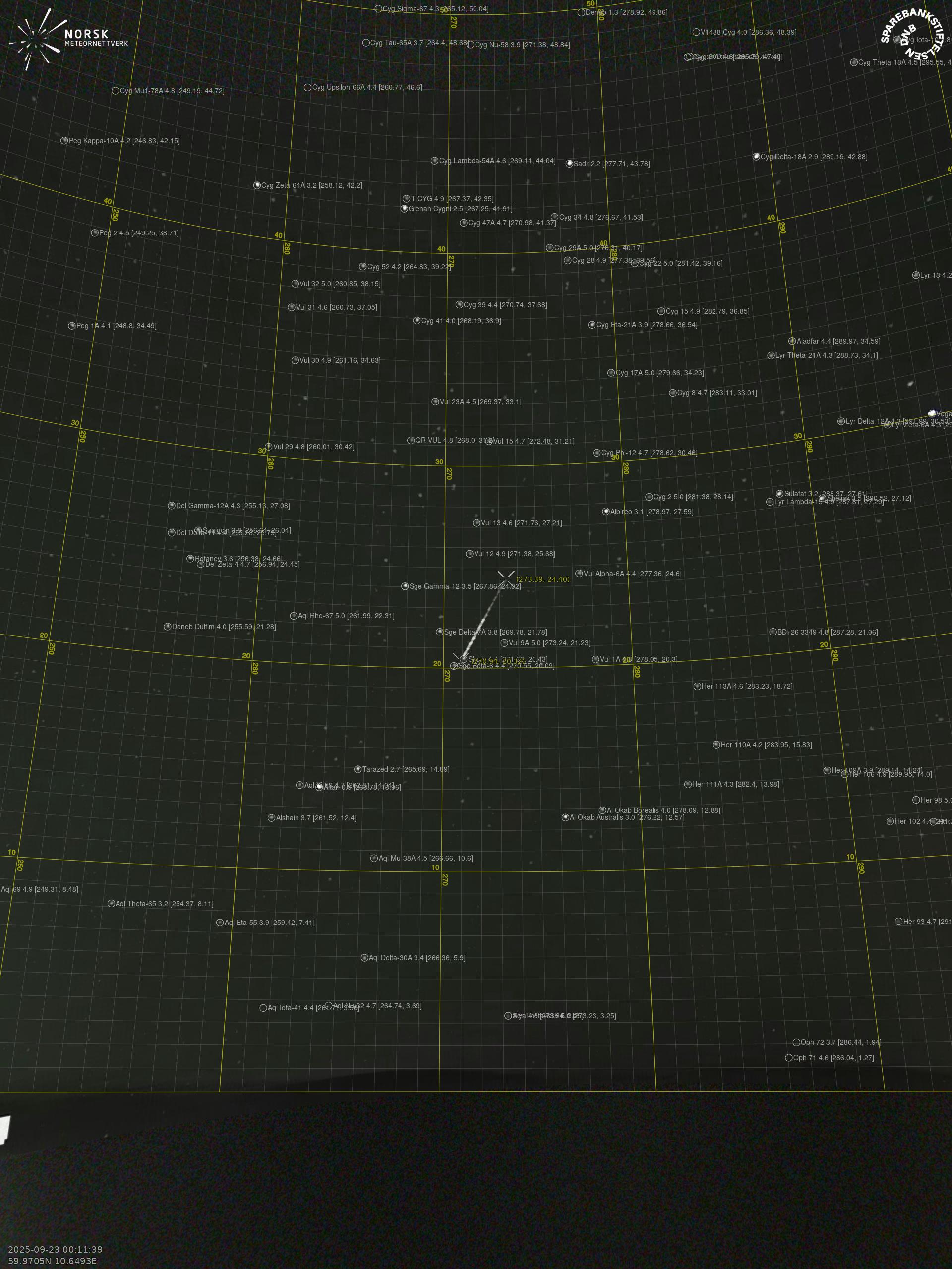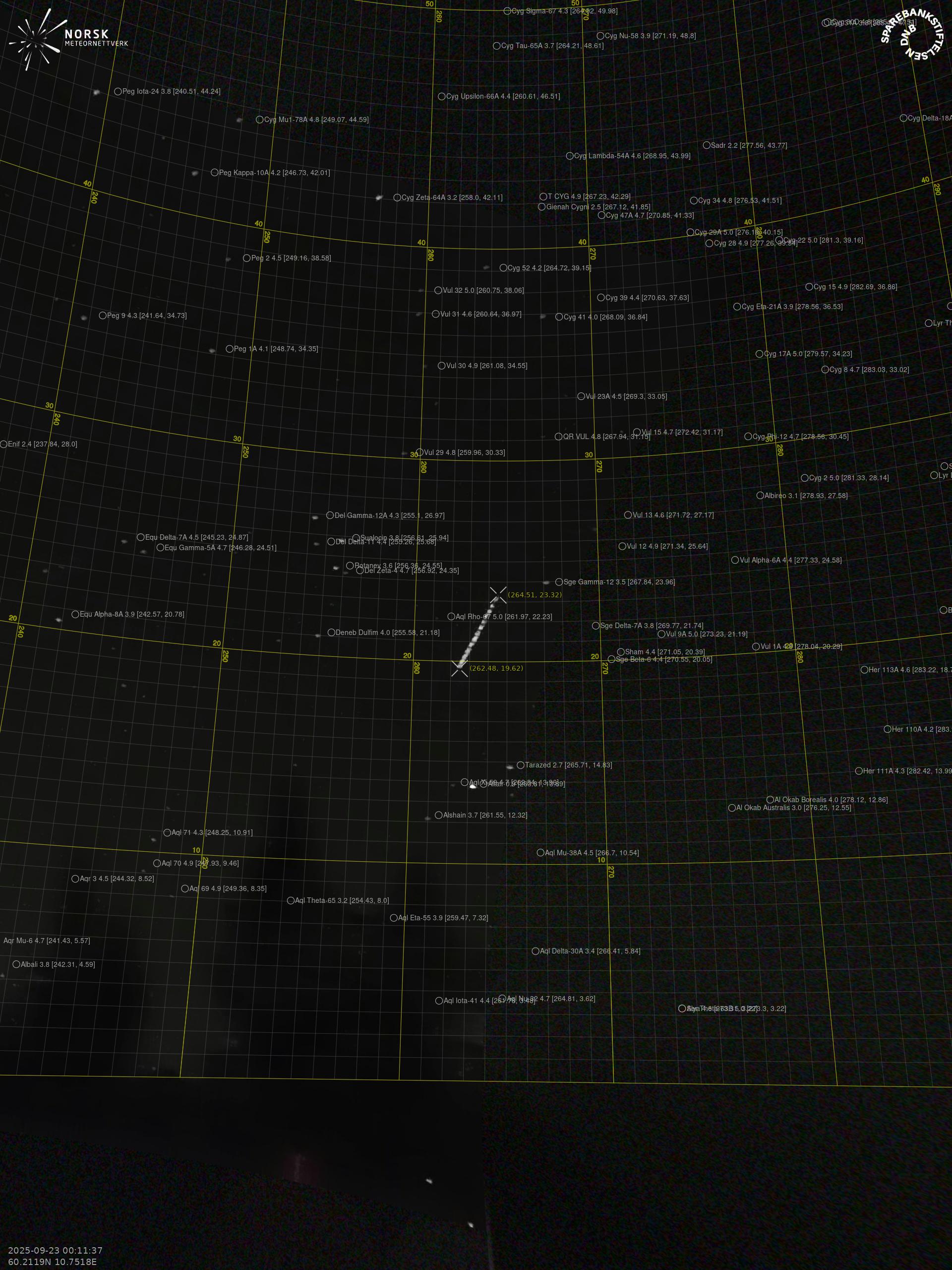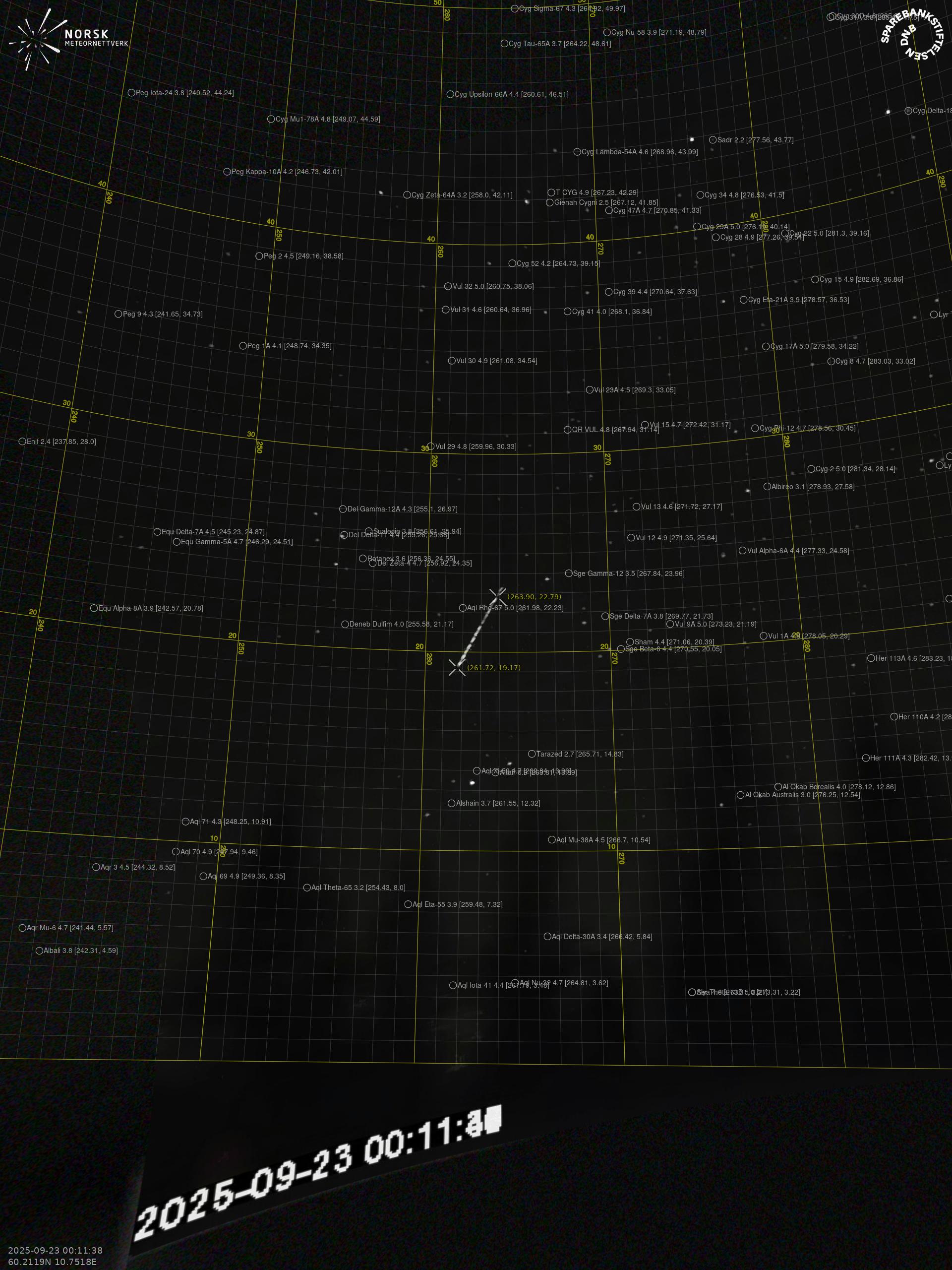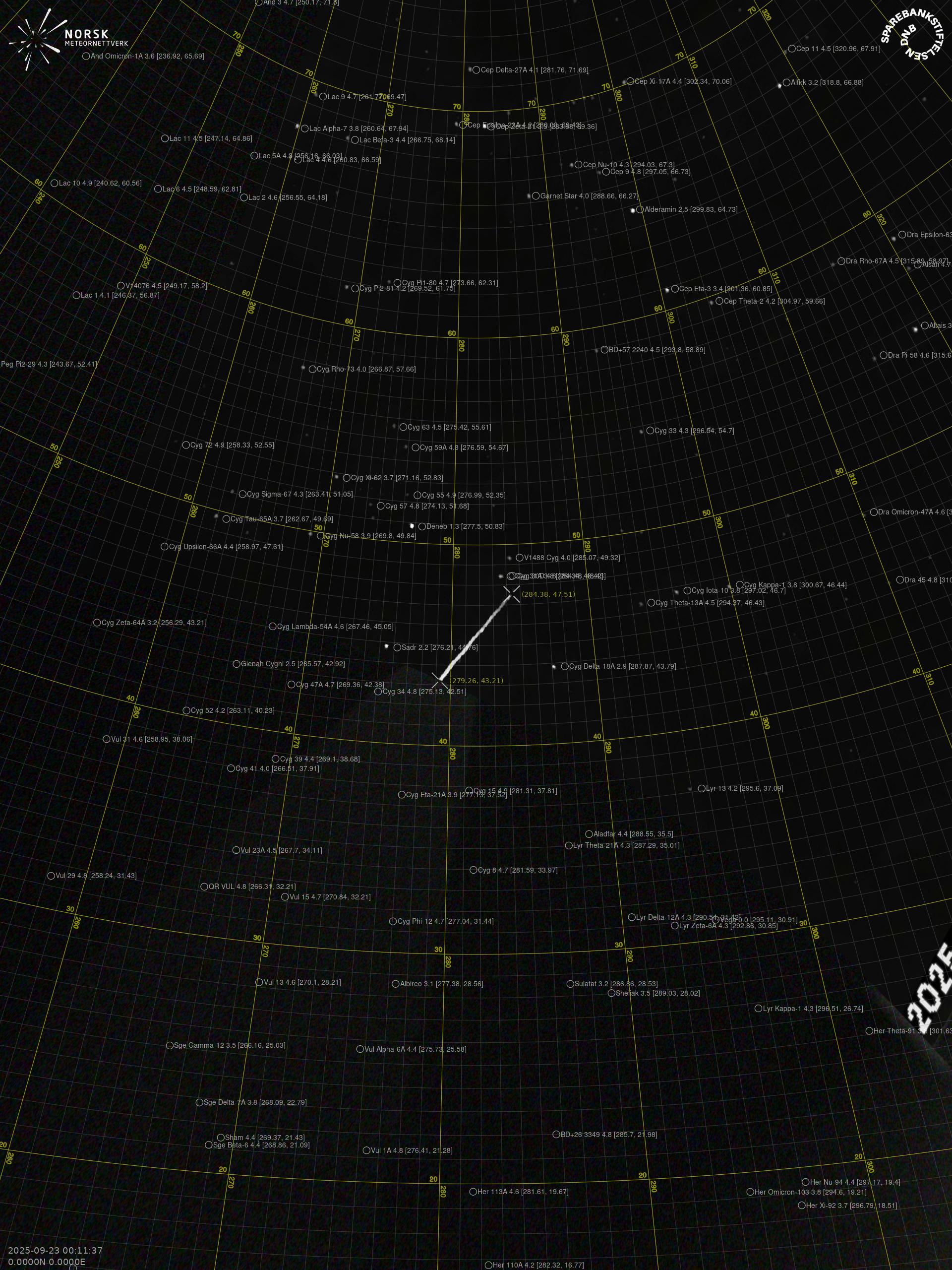 Kartet viser peilingene for meteoren. De lysere linjene viser retningene fra observasjonsstedene for meteorens tilsynekomst, og de mørkere linjene viser hvor den sist kunne sees. Den blå pila viser meteorens synlige ferd.