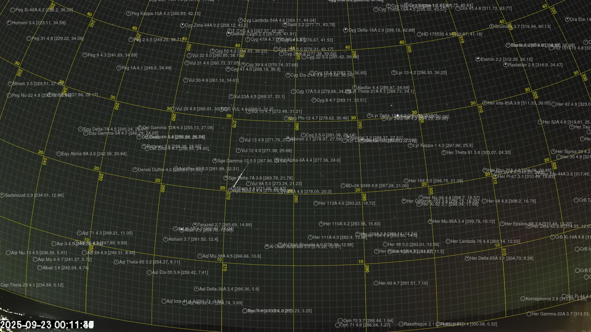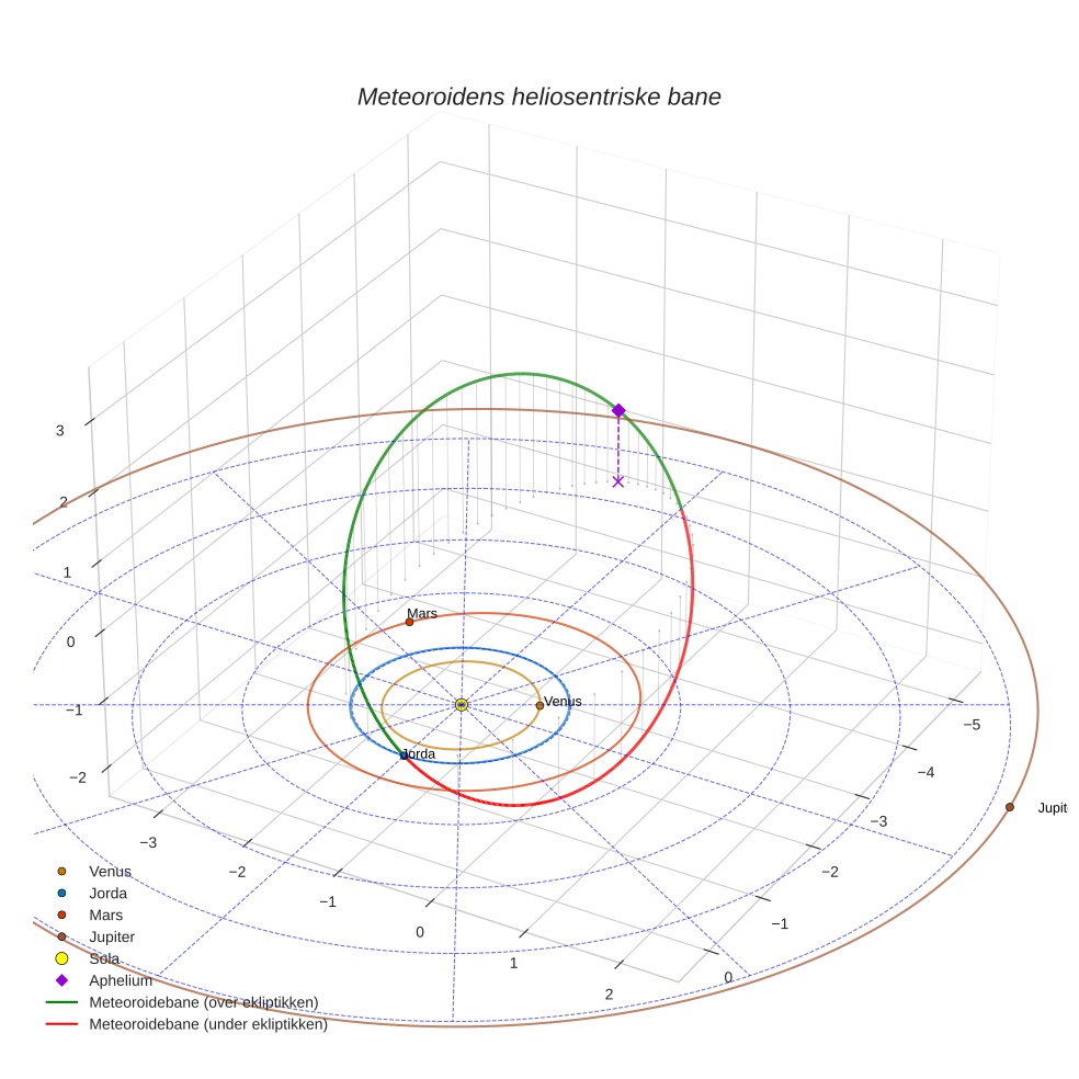Plottet under viser meteoridens bane i solsystemet. Grønn del av banen ligger over ekliptikken og rød del under.